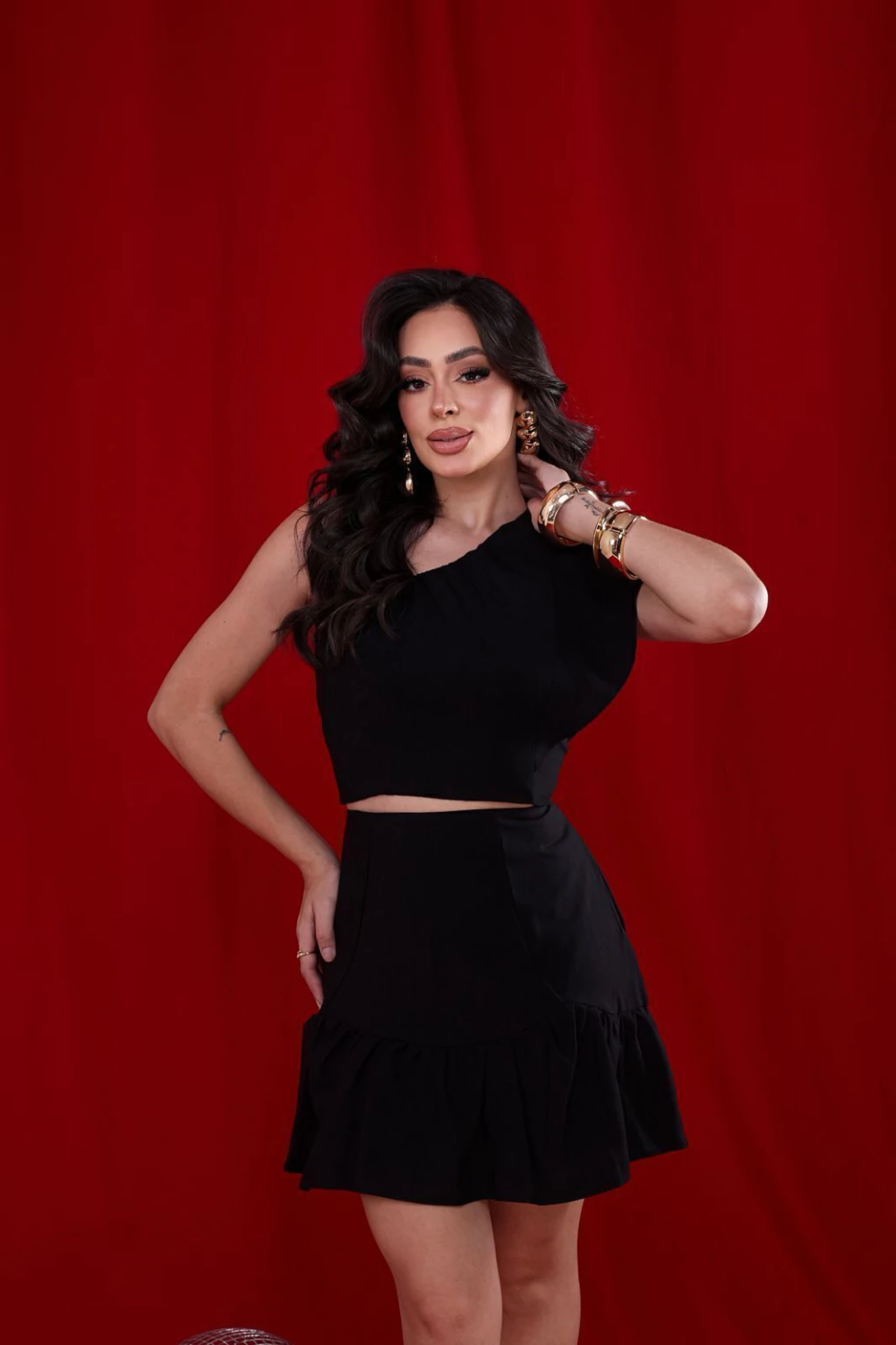 Conjunto de saia no tecido marant,cropped com babado unilateral, todo duplo,